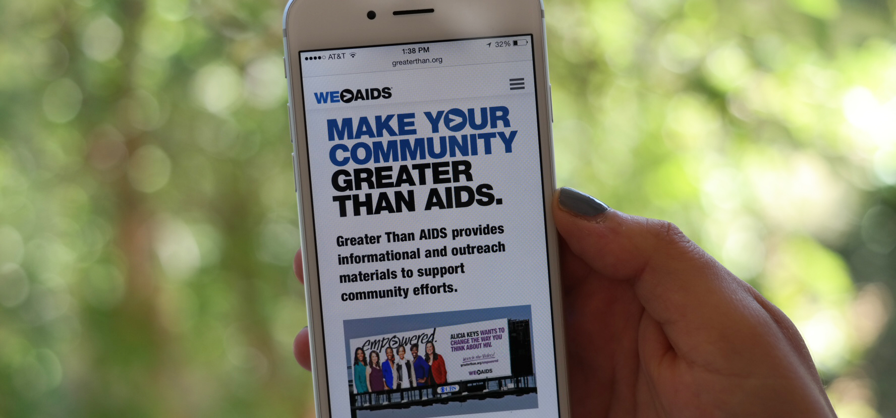 Hand holding a smartphone displaying a graphic reading "Make your community Greater Than HIV"